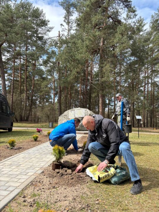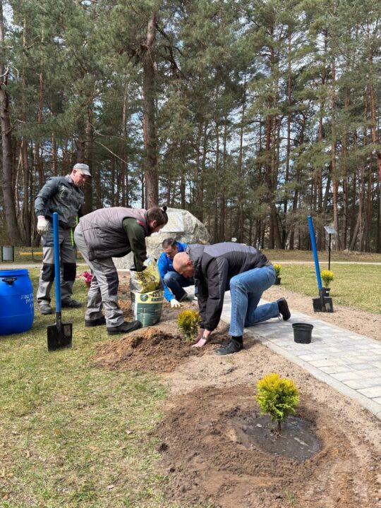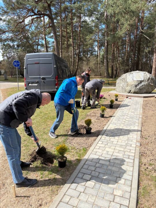 Работники во главе с руководителем посадили растения у Мемориального знака